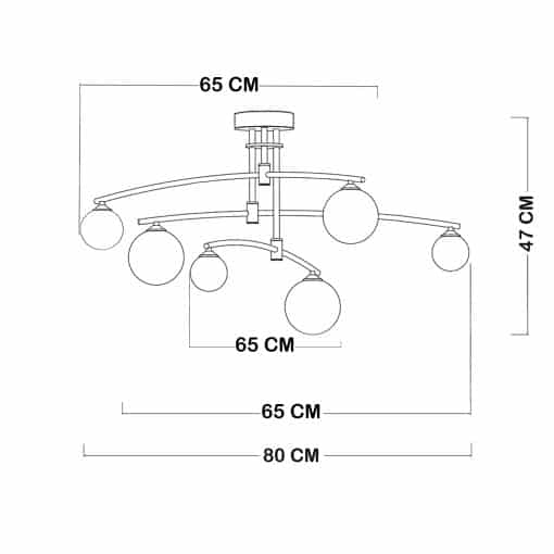 Elegant taklampa med sex vita glasskärmar i modern stil. mattsvart metallram med en diameter på 80 cm och en höjd på 47 cm. Passar perfekt i vardagsrum och belyser upp till 20 kvm.