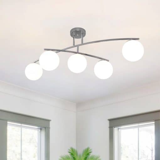 Pia taklampa i krom är en modern taklampa med 5 mjölkvita kupor av glas, Elegant design med bågformade armar och rörlig undre del. och stilren kromfinish. Den ger ett starkt, jämnt ljus, perfekt för både hemmiljöer och kontor.