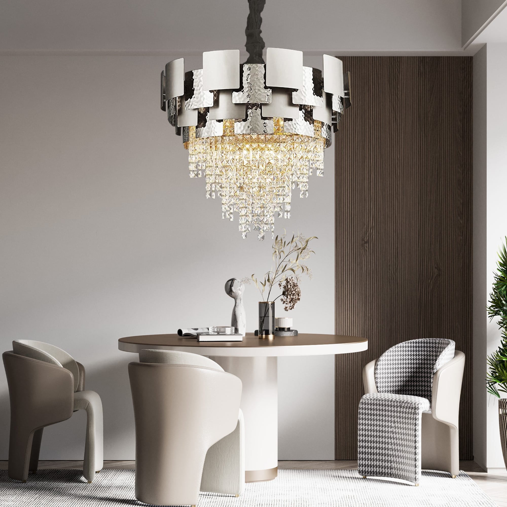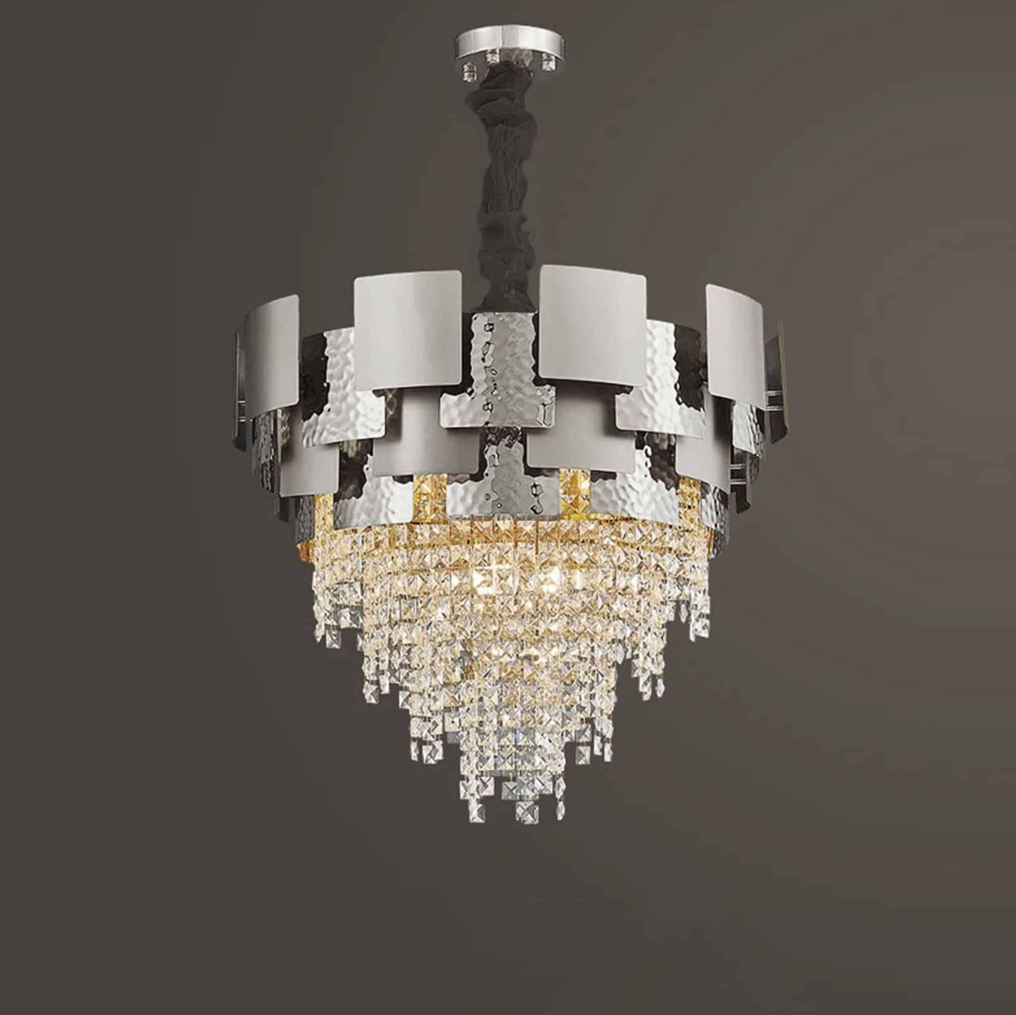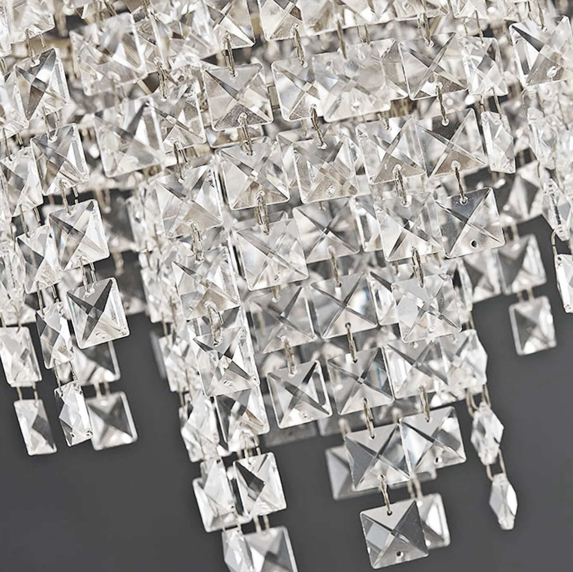 Selma taklampa rund är en mycket elegant kristallkrona som förgyller både det moderna hemmet likaväl som det mer klassiska rummet med sin luxuösa och imponerande design. Taklampans stomme är tillverkad av kromfärgade metallplattor och smyckad med ett flertal kvadratiska mindre prismor som hänger i klasar runt hela armaturen. Selma ger en känsla av modern industriell design samt skapar en tidlös känsla i alla rum du väljer att hänga armaturen i.