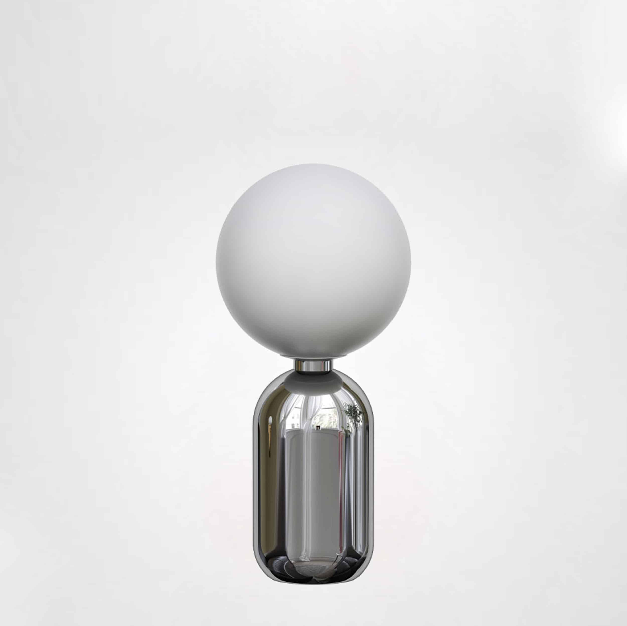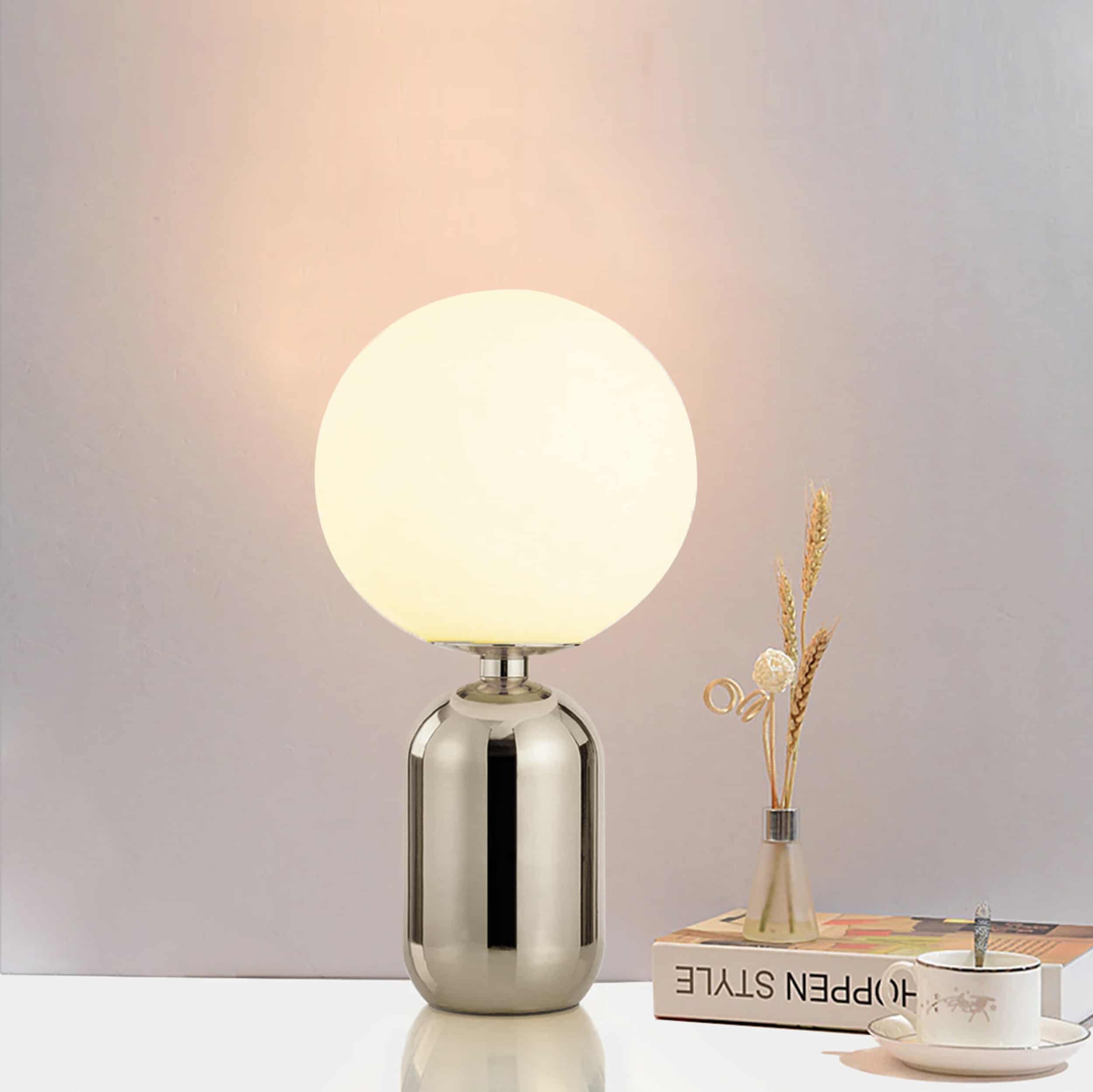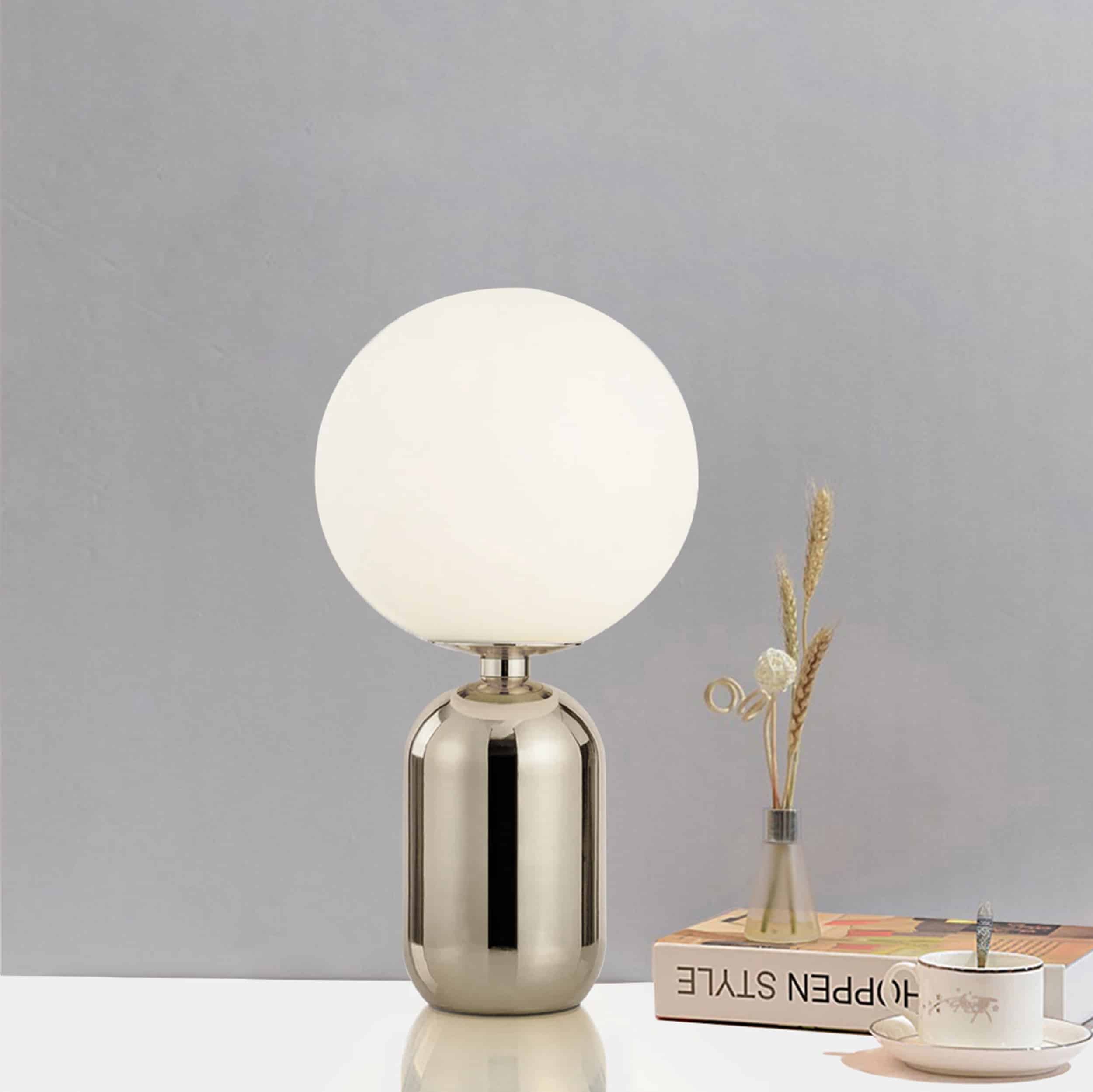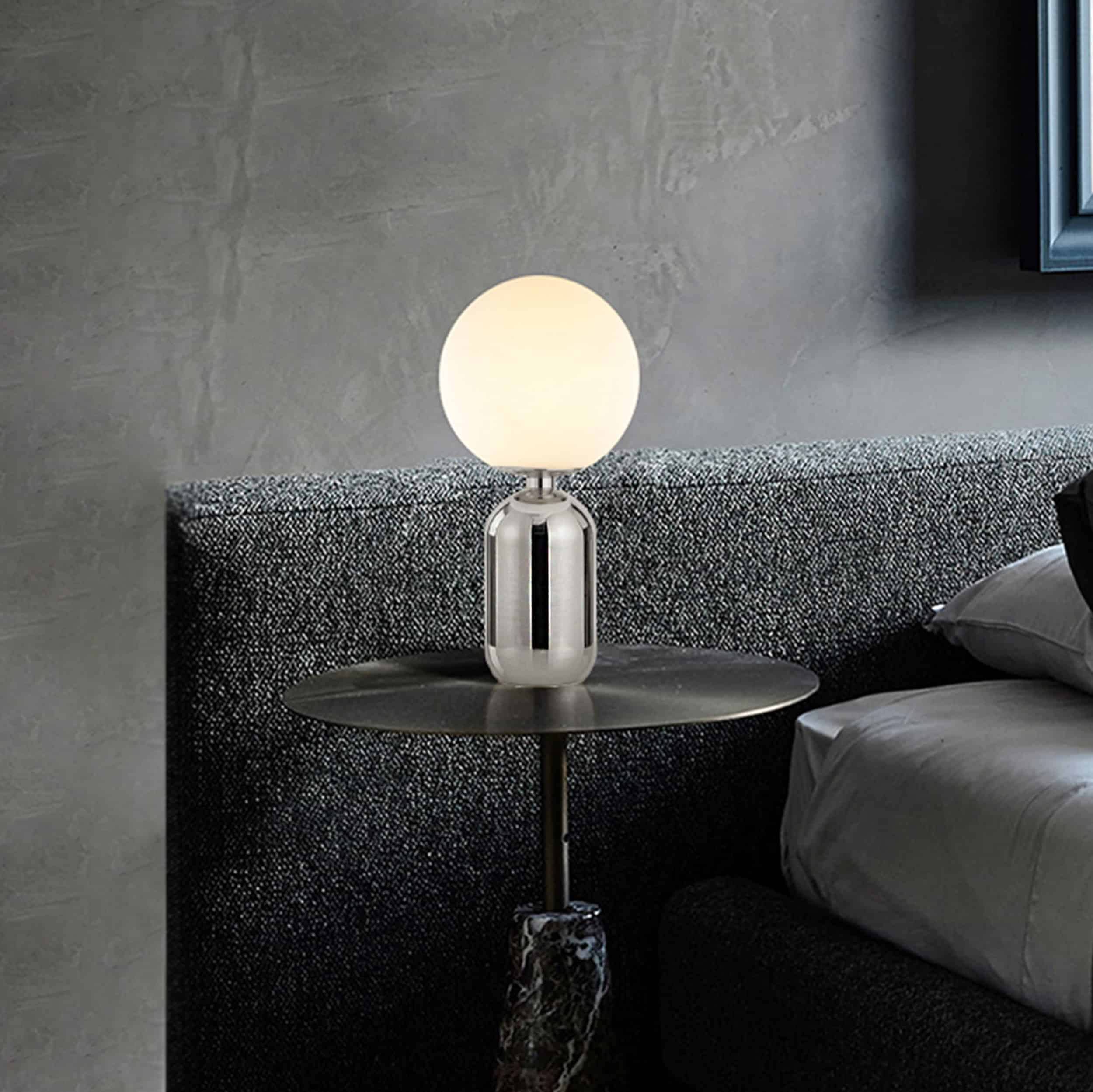 Vincent bordslampa är en kraftfull krabat till bordslampa som står på glänsande cylinderformad, kromfärgad stomme och toppas av en stor frostad, mjölkvit klotformad glaskupa. Vincent är elegant och bordslampans varma ljus bjuder på en belysning som passar alla stämningar i hemmet.